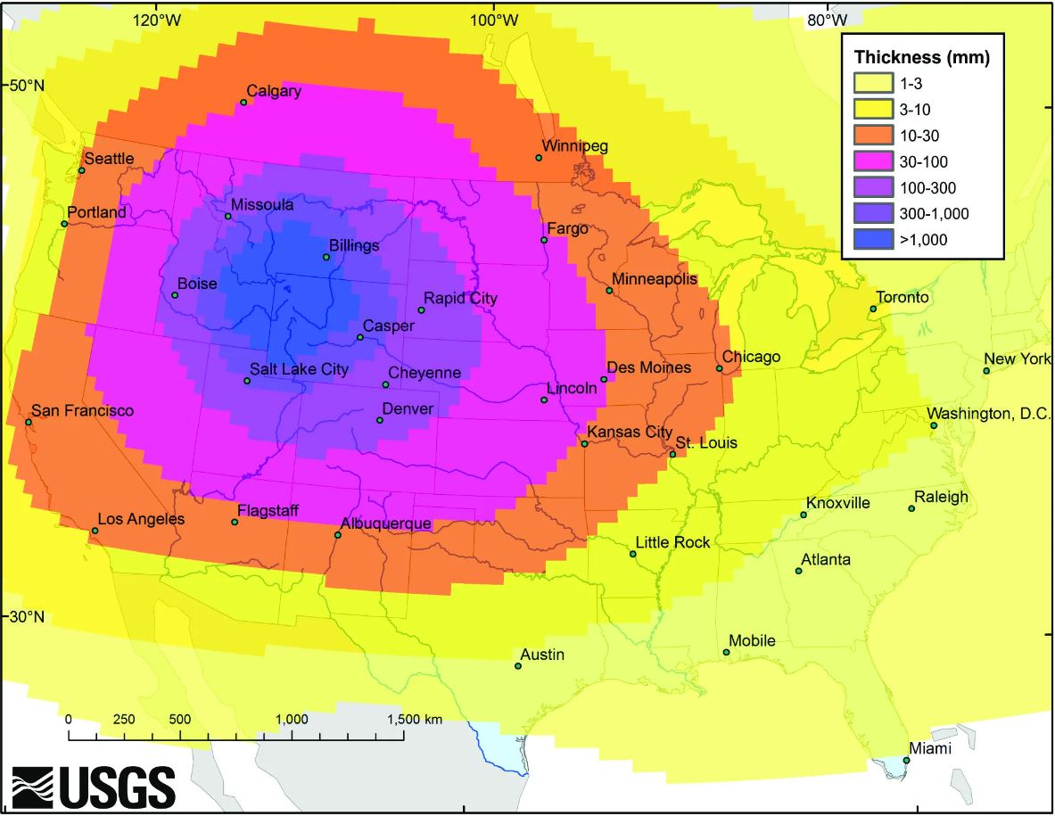 The effects of a Yellowstone eruption would extend far beyond the immediate vicinity, impacting much of the United States. Does everyone remember the Icelandic volcano crisis in europe? Eyjafjallajökul brought European air travel to a standstill for weeks with an eruption of just 0.25km of material. If the eruption is anything close to the Huckleberry Ridge eruption, then 9,800 times more material will be entering the atmosphere. At a time when the US really needs the support of its emergency services, armed forces, and any other able man, woman or child, the entire country will find that roads, bridges, and buildings would be damaged or destroyed, critical infrastructure and communications would be damaged, people would be unable to respond in anything like a coordinated fashion. Chaos would rain down alongside the choking ash. Within a few days, ashfall will destroy crops and livestock, leading to food shortages and the collapse of the ability of the US to sustain a population. The economic loss would be total. Cities such as Denver, Salt Lake City and Billings would be caught in the ashfall. Depending on winds, cities as far apart as Los Angeles and New York could also be impacted.